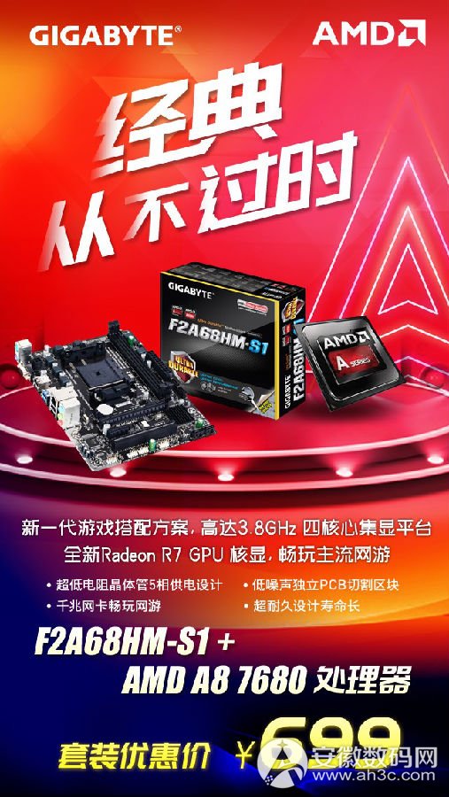 然后第二款是由AMD全新第七代APU A8-7680处理器和技嘉主板全力搭配的超值板U套装,这款套装中的技嘉F2A68HM-S1主板非常给力,采用CPU全固态电容供电,并支持A系列处理器AMD混合交火技术,可以说搭配着A8-7680处理器真是天衣无缝。而拥有四核心的A8-7680处理器对于入门级用户及中小型企业绝对够用,并且这款处理器有FM2+接口,且基础频率为3.5Ghz,最高3.8Ghz频率,让用户在使用过程中流畅无比,不再感觉卡顿,十分给力。